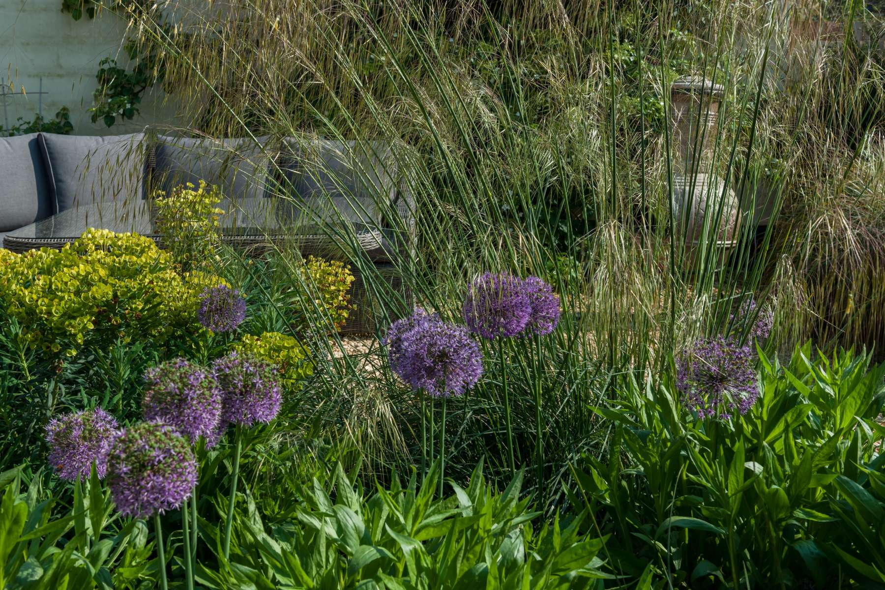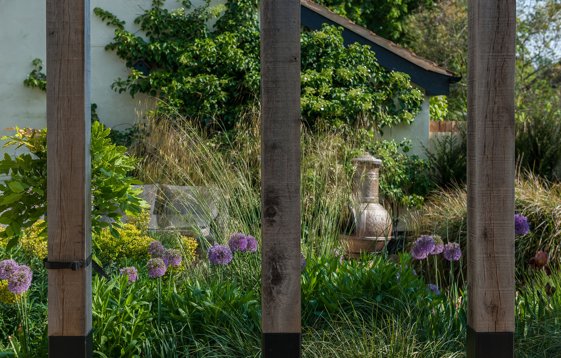Features Include: Bespoke Oak Pergola, Evergreen planting scheme with herbaceous elements, Stone Garden Terrace, Sun Loungers, and Pleached-Trees. Additional services included Garden Lighting and Garden Furniture sourcing.