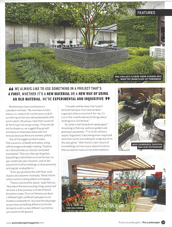 As part of their recent focus on Podium Landscapes (which include roof terraces and any other gardens built ontop of buildings or car parks, for example), Pro Landscaper magazine recently issued a special supplement entitled ‘Podium Landscapes’. It was gratifying to see Aralia featured amongst the select group of designers and experts in this field with a double page spread in the supplement. As winner of the inaugural Podium Landscapes Award for Domestic Design, Aralia is rightly seen as a leader in the field of designing rooftop gardens, as well as a respected innovator across the whole gamut of garden design specialisms.