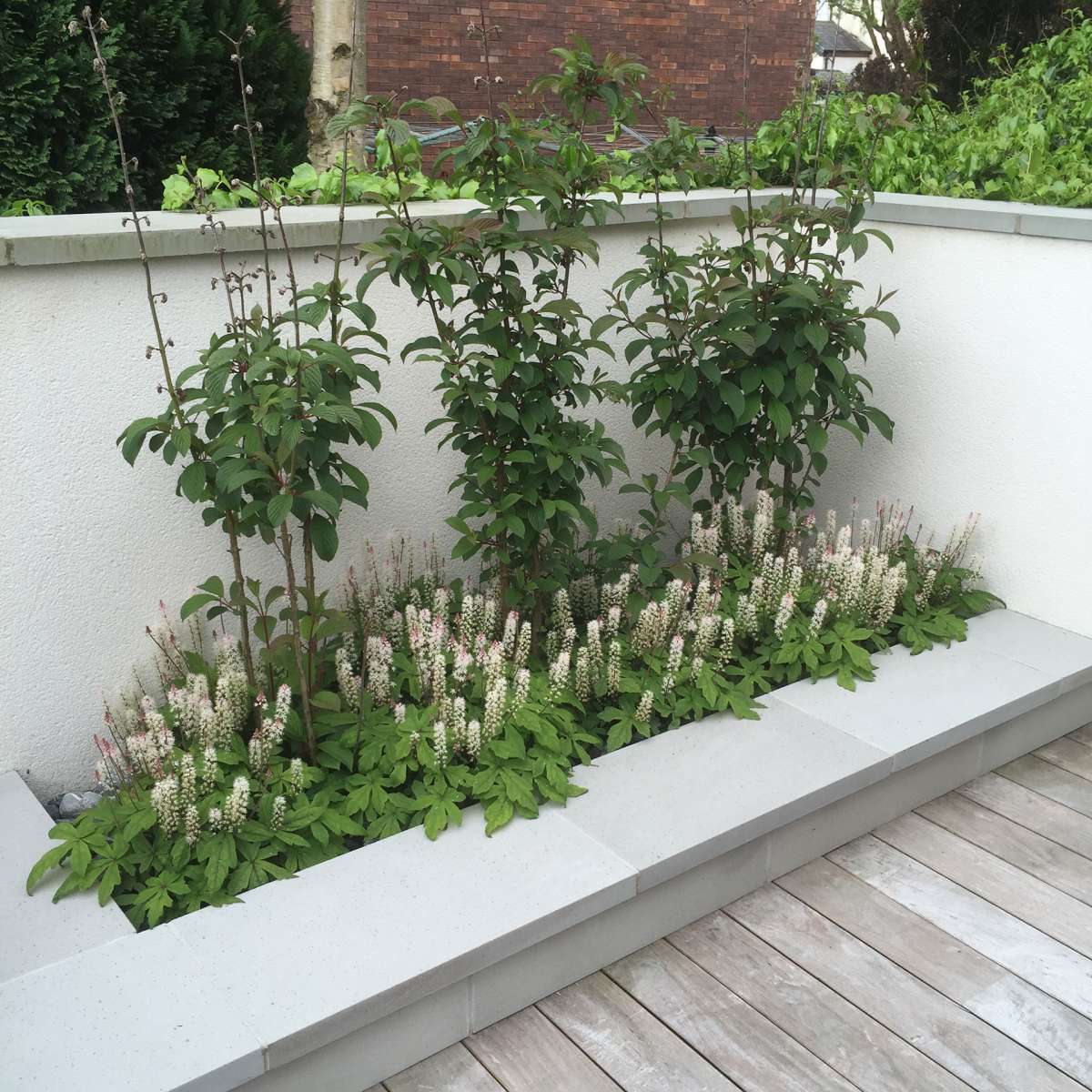 Bespoke Galvanised Powder Coated Planters, Hardwood Decking, Natural Sandstone Paving with Sandstone Sett detail, Contemporary Rendered Tree planter, Rattan Garden Furniture, Contemporary Hard wood slatted Trellis, Garden Lighting, evergreen & herbaceous planting.