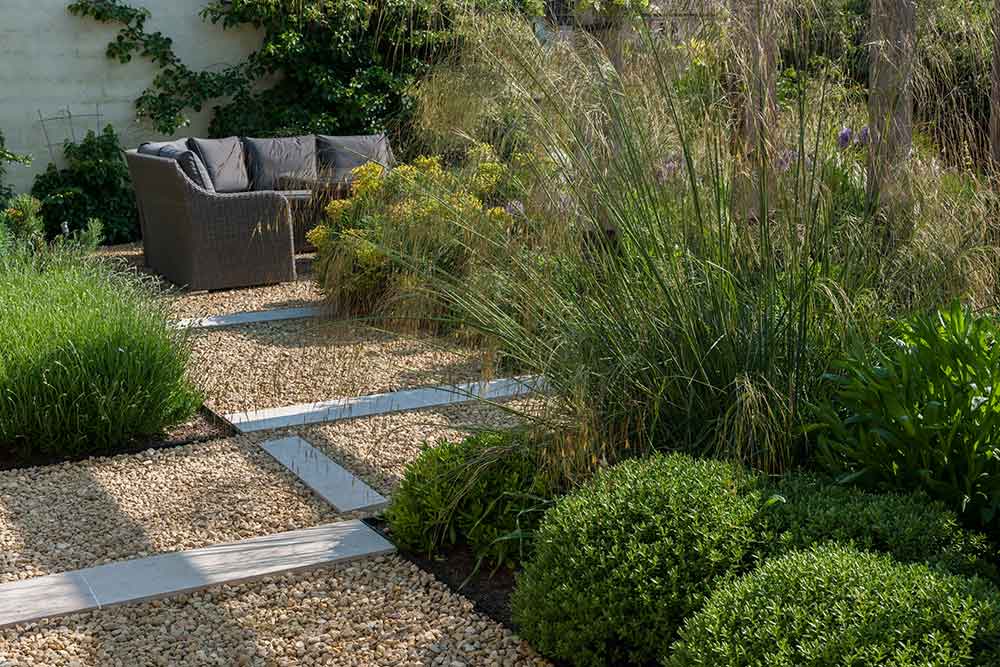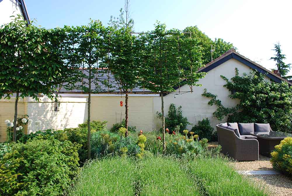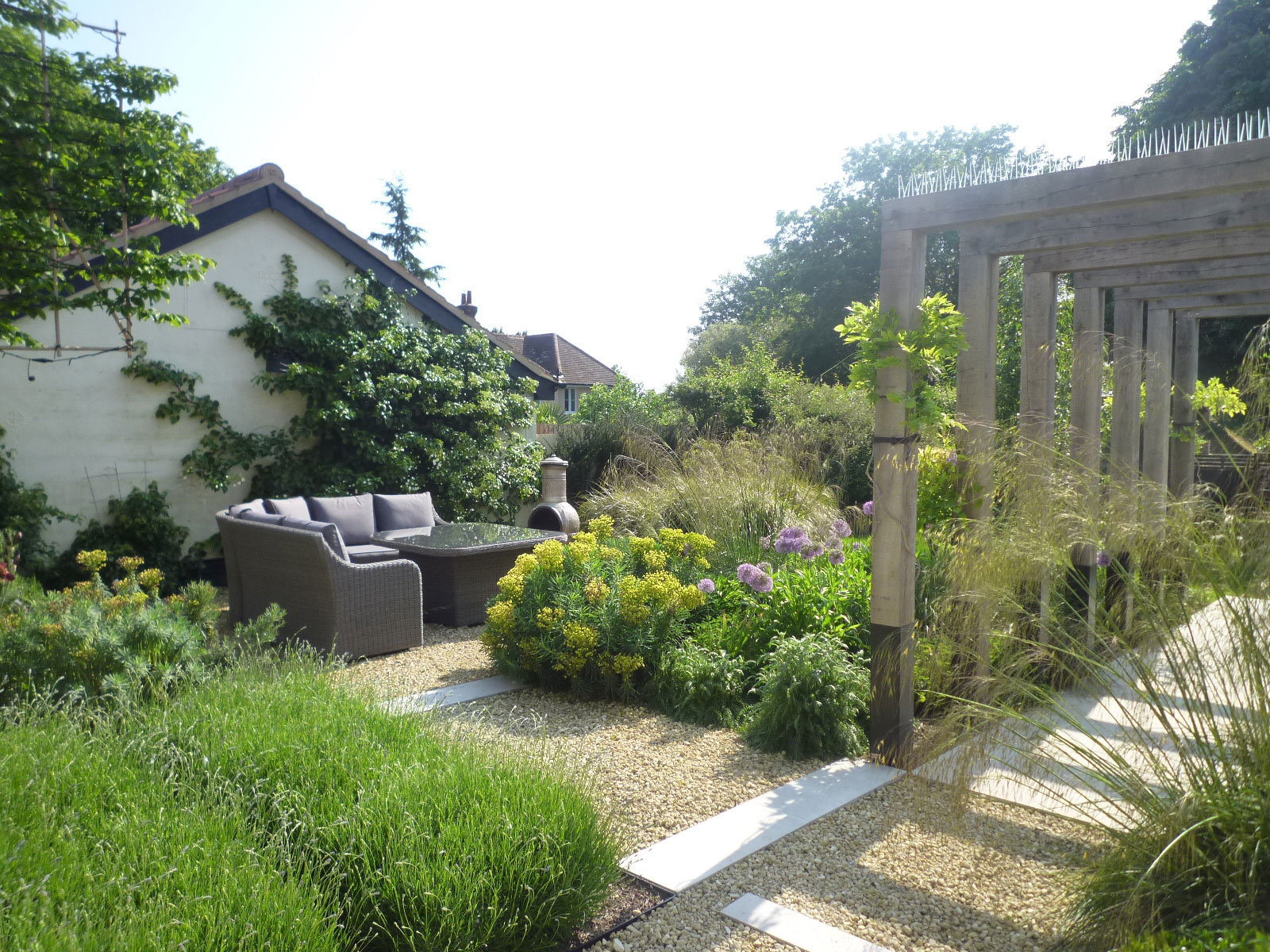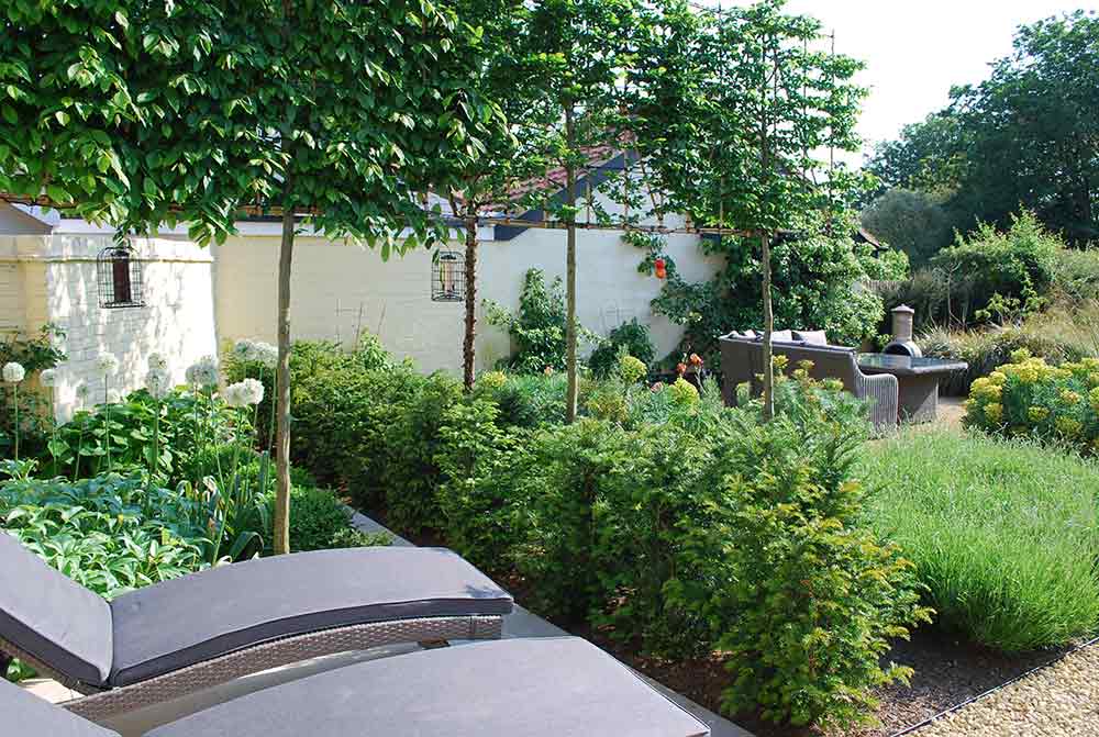 Bespoke Oak Pergola, Evergreen planting scheme with herbaceous elements, Stone Garden Terrace, Sun Loungers, and Pleached-Trees. Additional services included Garden Lighting and Garden Furniture sourcing.