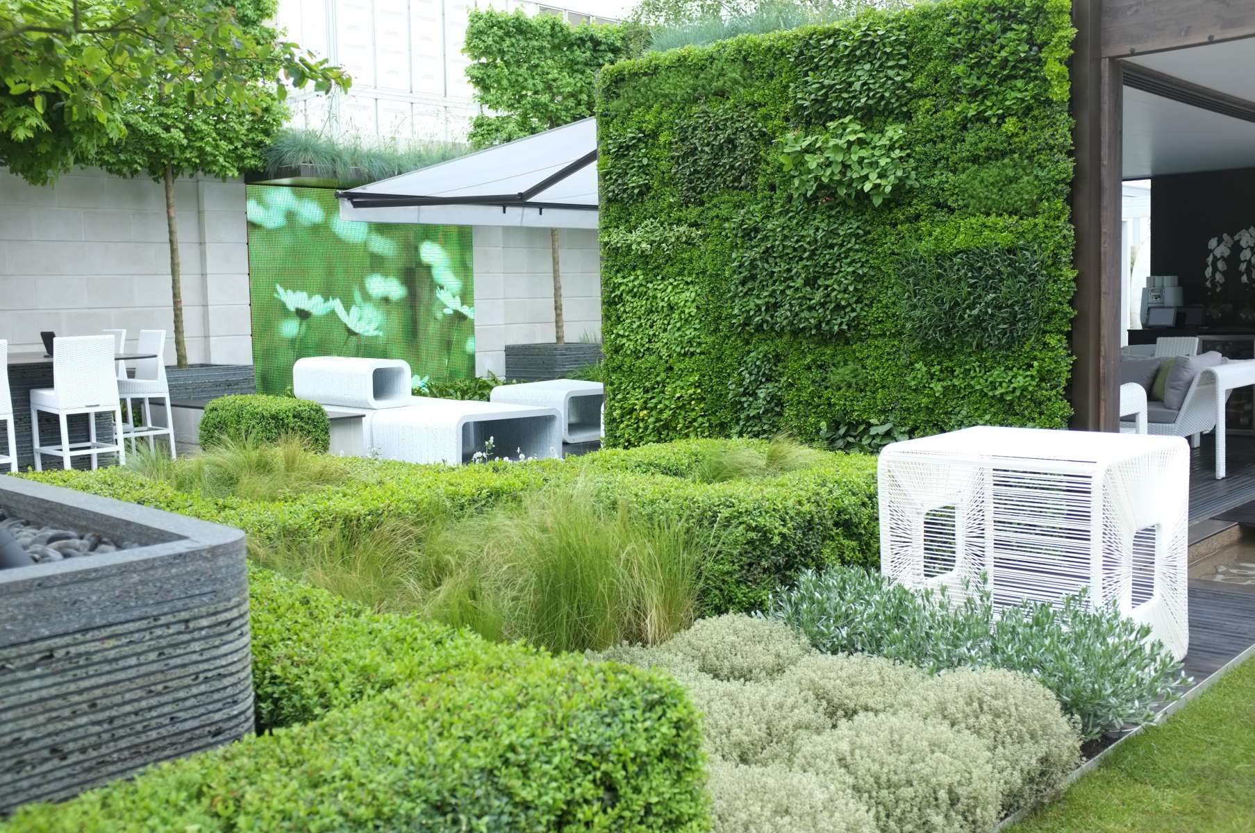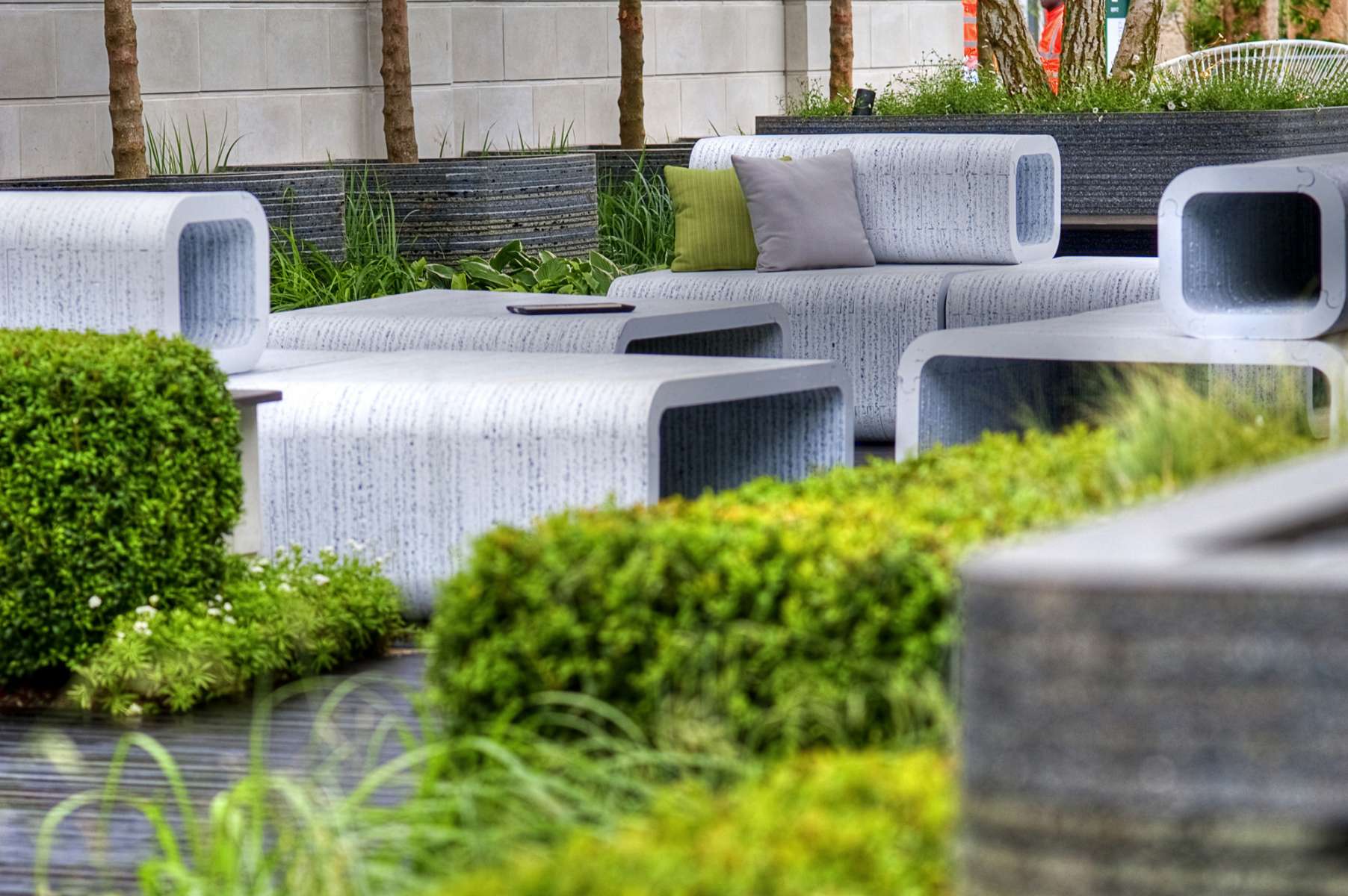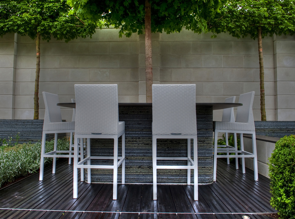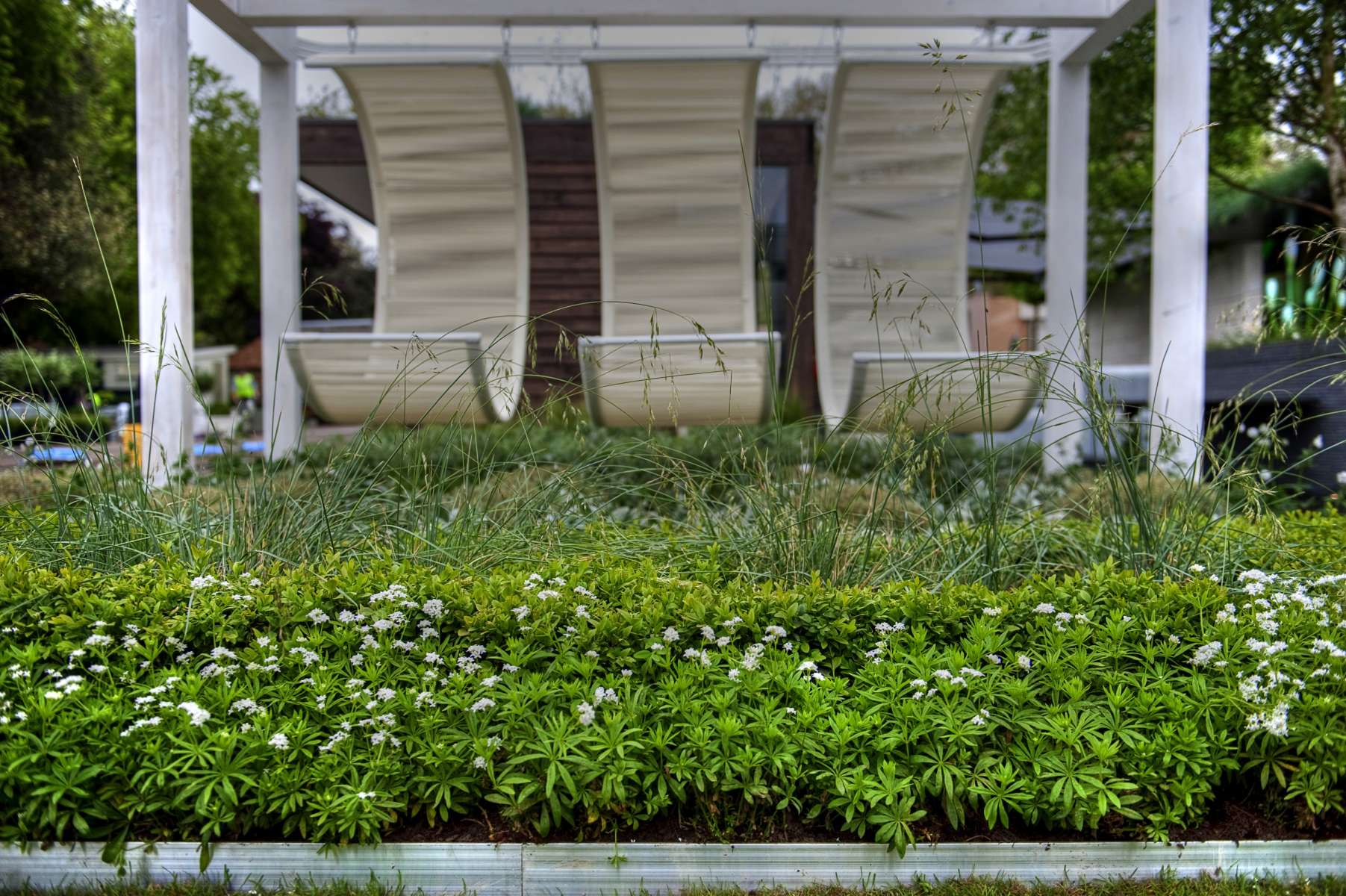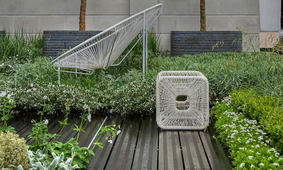 As well as introducing 21st Century technology to the Show Gardens category at the RHS Chelsea Flower Show, Patricia has also selected a number of innovative materials which are economically friendly, including bamboo decking made from fast growing bamboo which proves extremely ecological. All the tabletops have been built using a brand new material produced from compressed recycled paper. The furniture and planters in the garden have been manufactured using brand new ‘up-cycled’ materials launched this year by Thomas Bramwell, including their modern take on the egg chair and quirky hanging ‘C’ shaped chairs hung from a modern white metal pergola, as well as ultra chic bespoke ‘sun’ sofa and chairs.